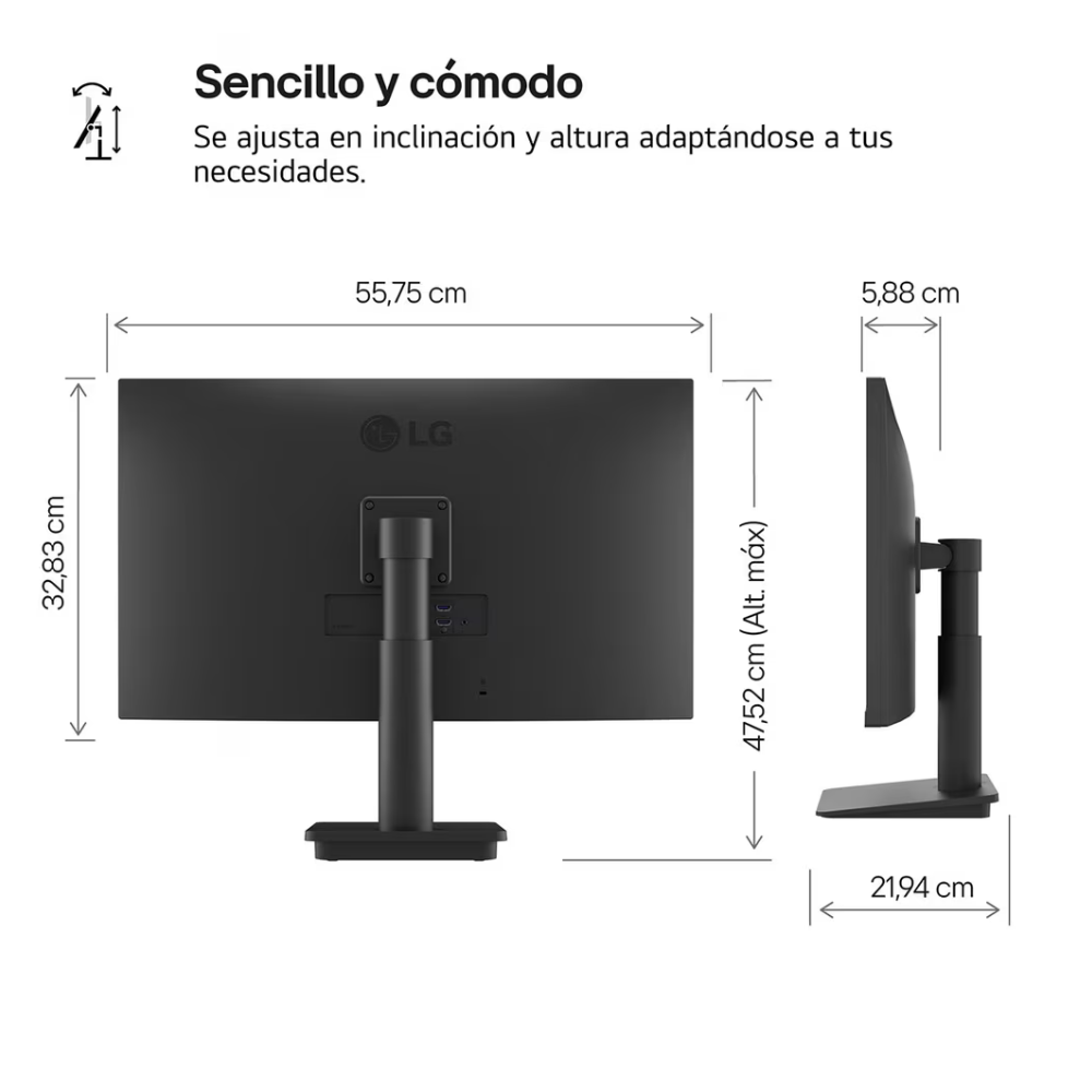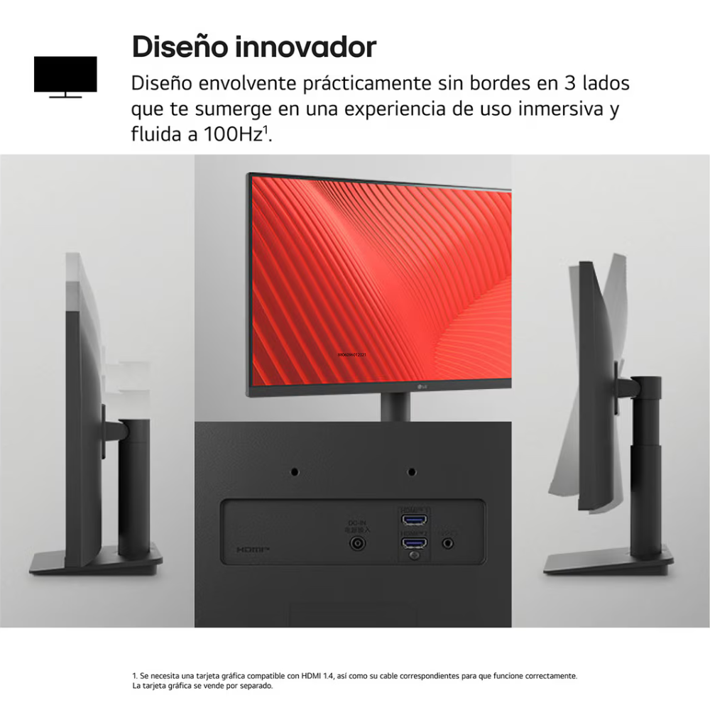 El soporte ajutable en inclinación y altura5 permite colocar la pantalla en la posición óptima para el usuario. Además, eleva la experiencia con su diseño prácticamente sin bordes en 3 lados.